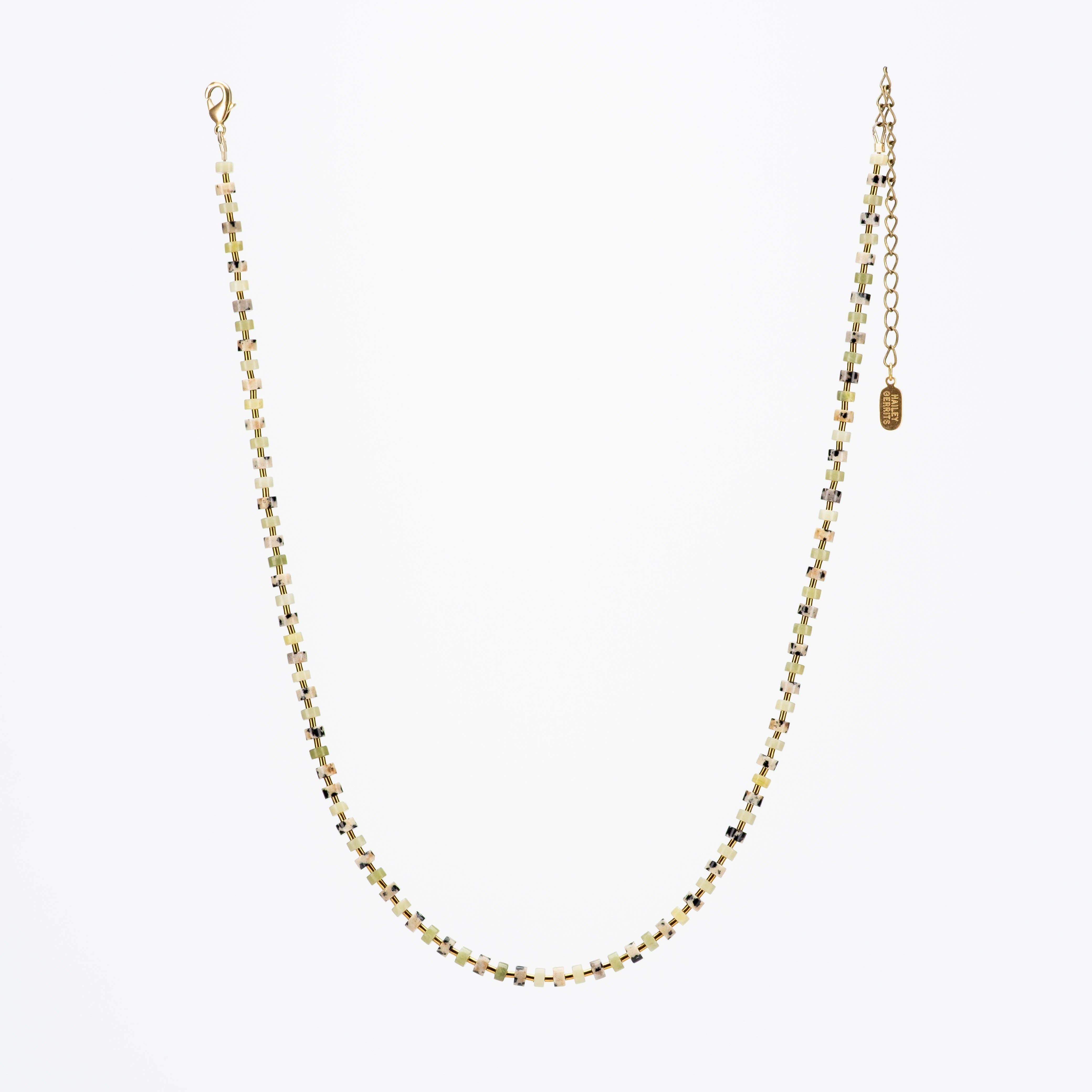 The FW25 Remy Necklace features an alternating pattern of Dalmatian Jasper with Peridot Jade beads.