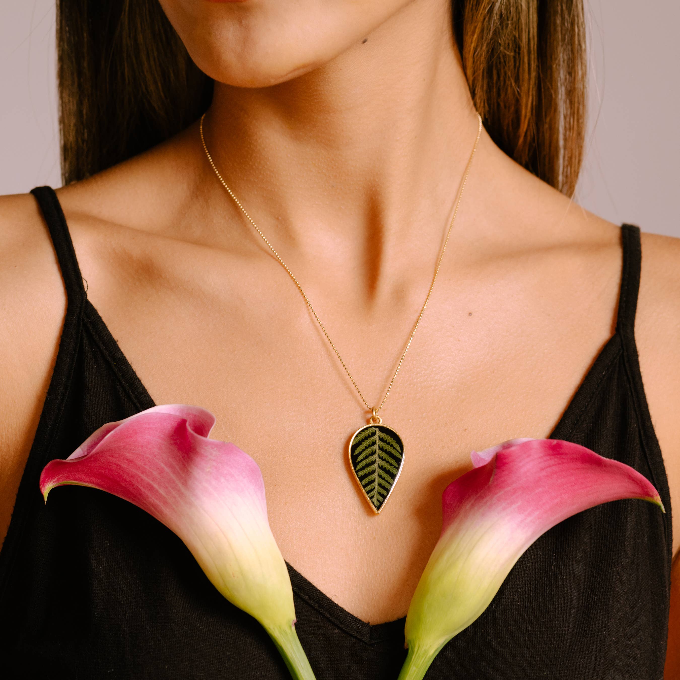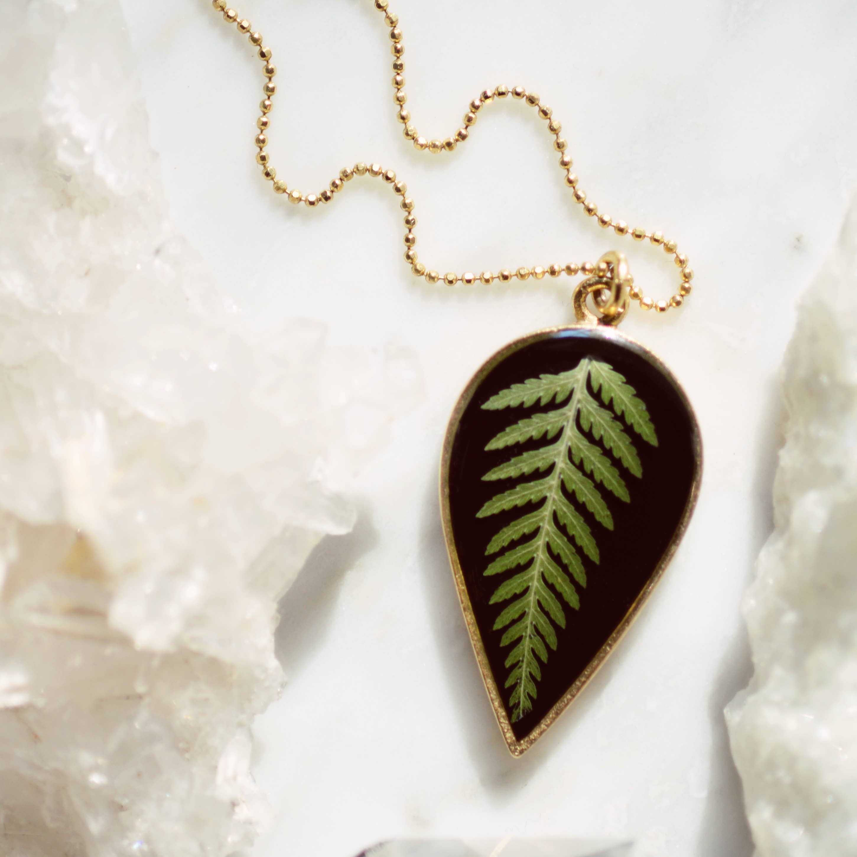 Beautiful pressed fern preserved in resin and set inside a 24kt gold plated teardrop setting.