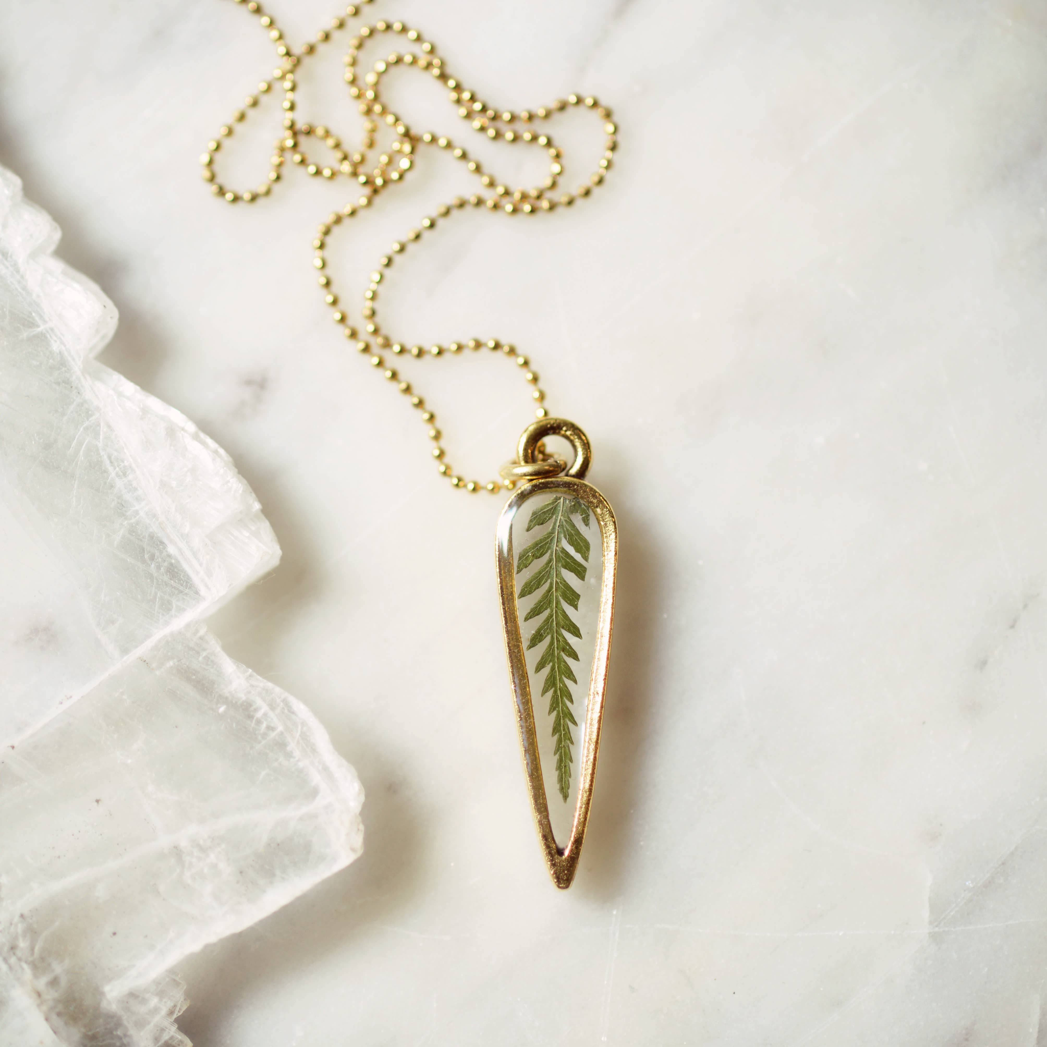 A real, beautiful pressed fern preserved in resin and set inside a 24kt gold plated spike setting.