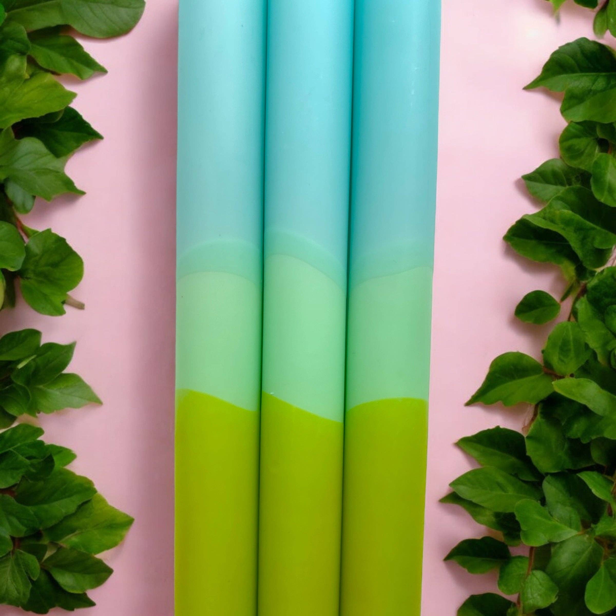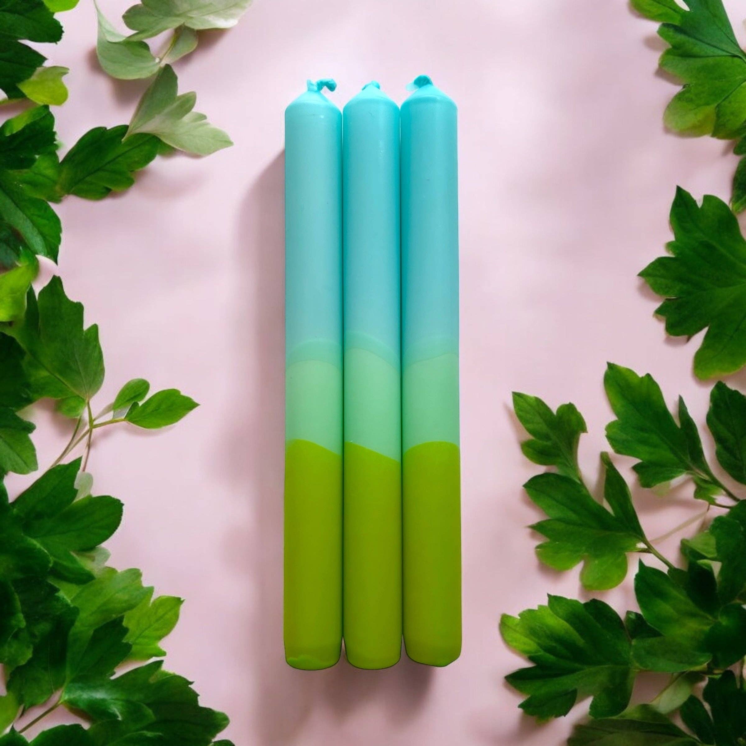 Bringing bold and cheerful life to any table, this vibrantly coloured candle trio in fresh greens and turquoise. Perfect for parties or special events, these candles look fabulous displayed in a glass candlestick holder.