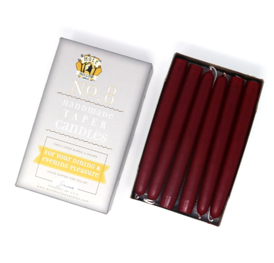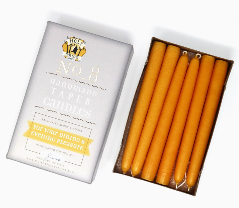 These hand dipped taper candles, or dinner candles, are sized at 7/8" diameter to fit most tapered candle holders.