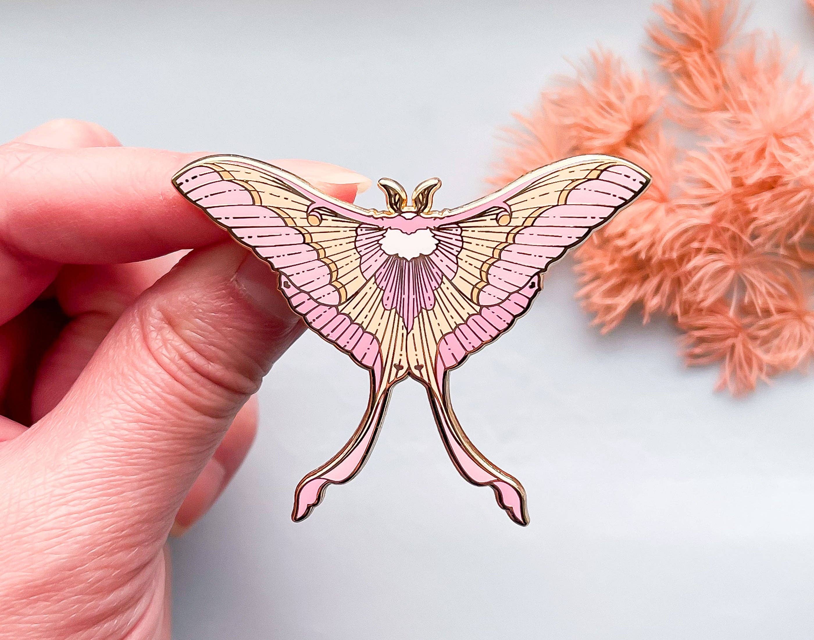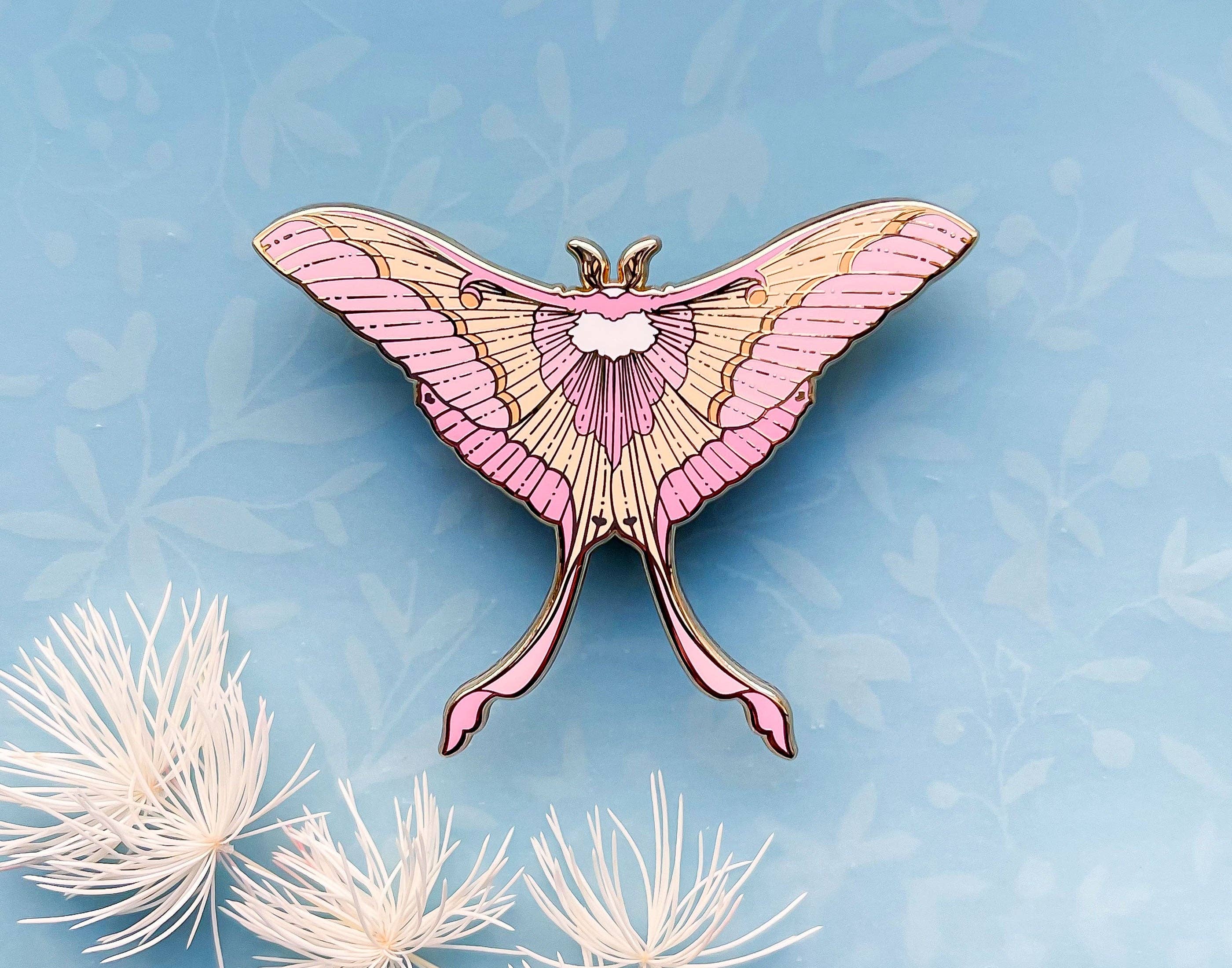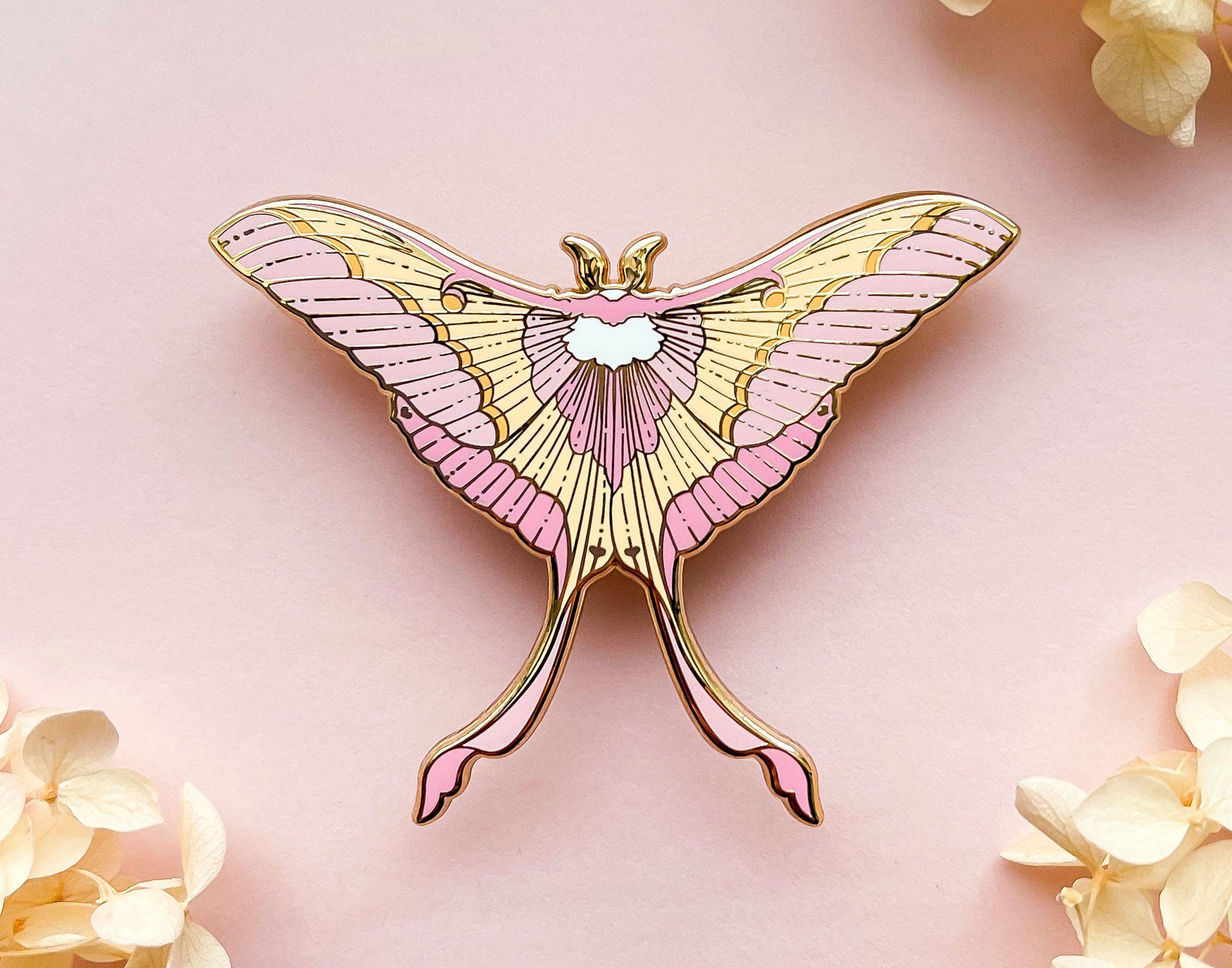 THE FEATURES - Highly polished gold-plated metal. - 2.25″ hard enamel pin. - Has two posts on the back to secure the pin and prevent rotation during wear. - Features a color palette of white, yellow and pink. - The Pink Spirit Moth illustration is based on my original artwork. - Stamped with "Alum & Ink" on the back. - Comes mounted on a backing card and packed in a bag for protection. - Photography props and backdrops not included.