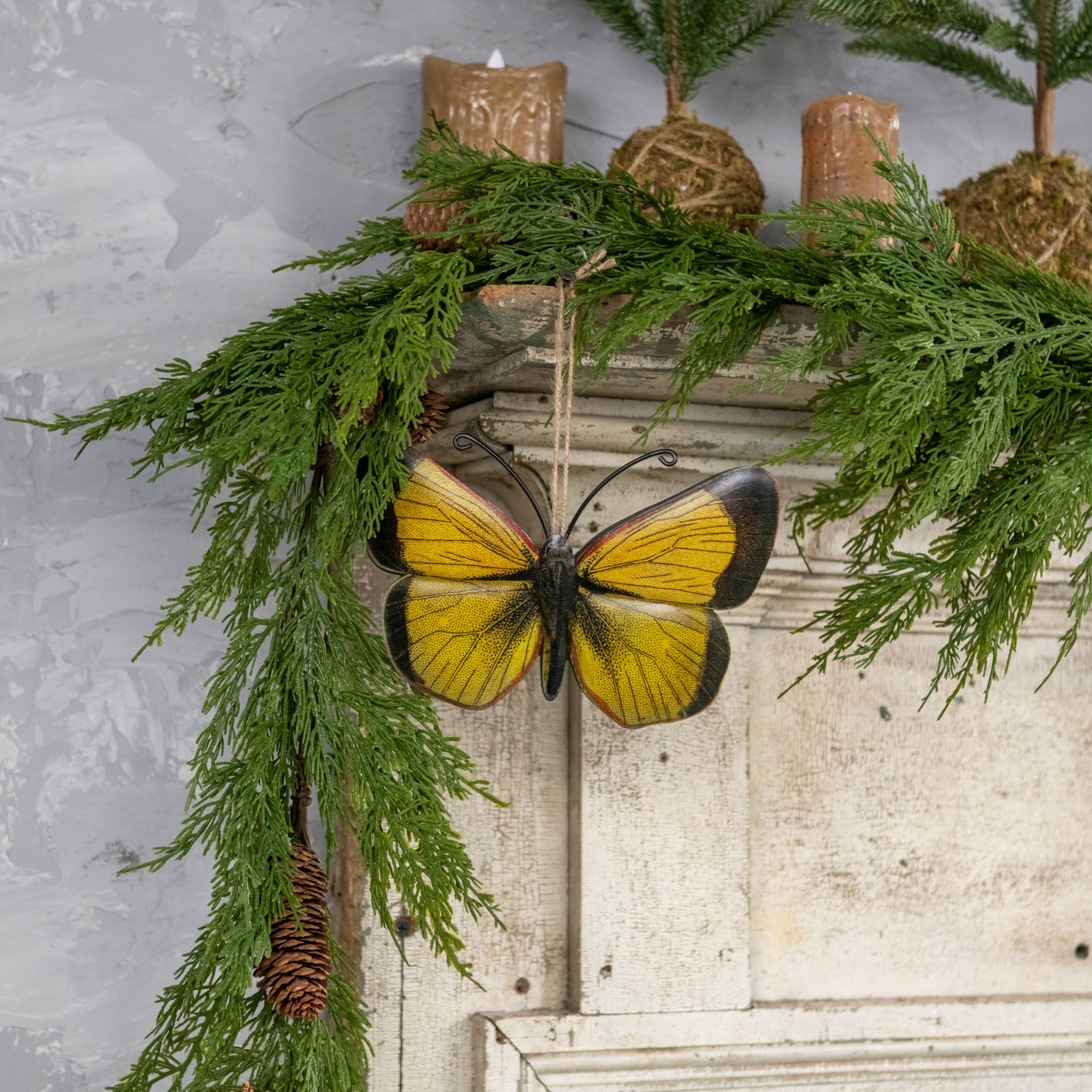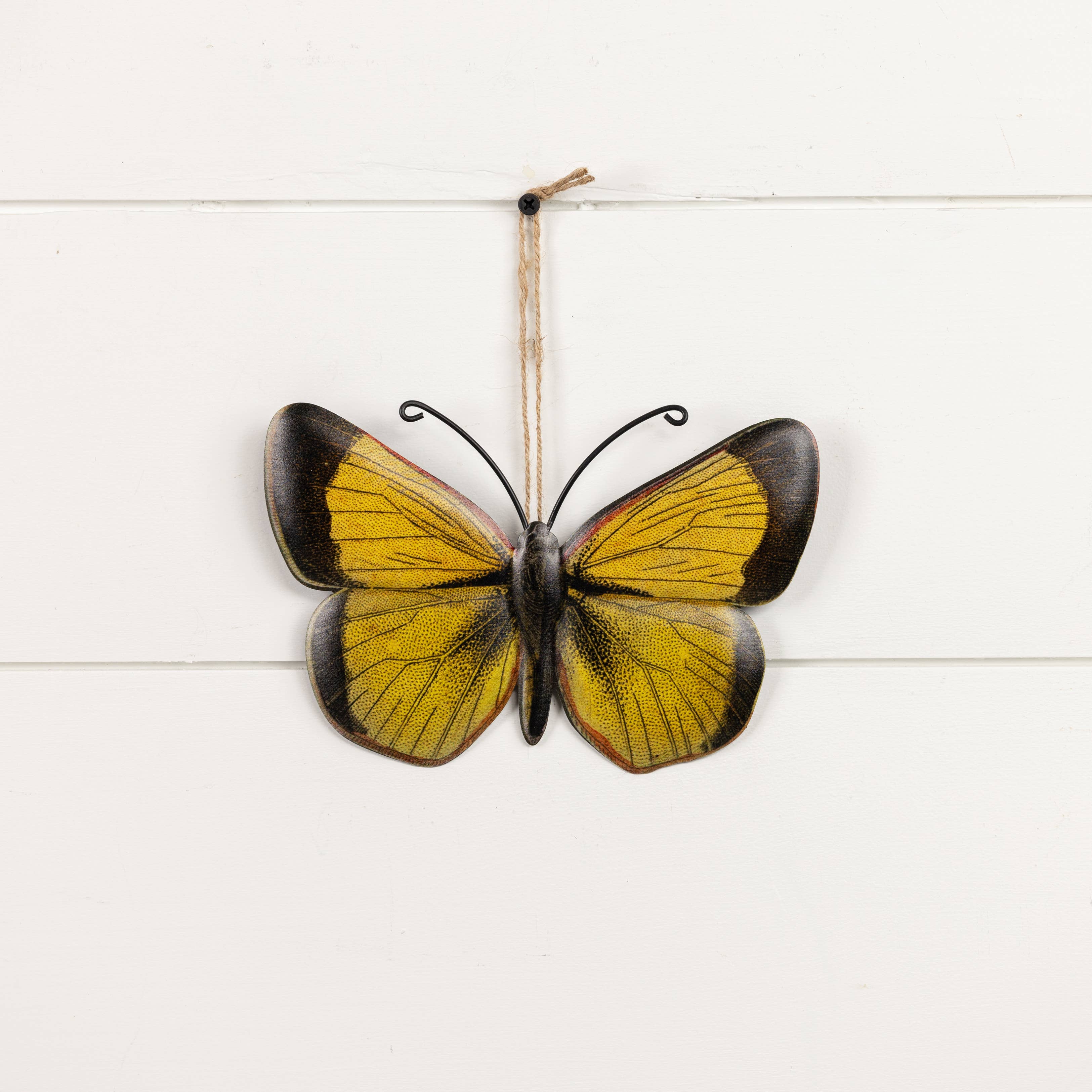 Metal wall art of a black & yellow butterfly with twine hanger.